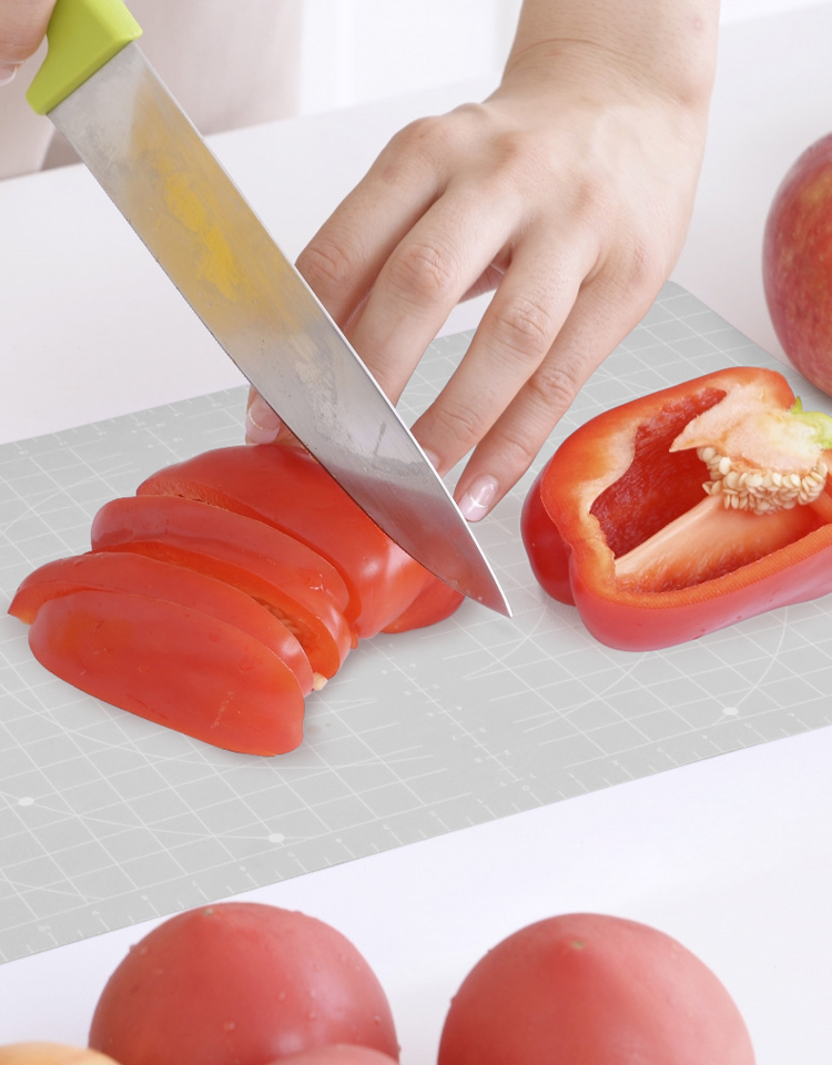 1cmの目盛りと円形の等分に便利なガイド付きシートで、柔軟性があり切った食材を鍋やボウルなどに入れる際も便利。